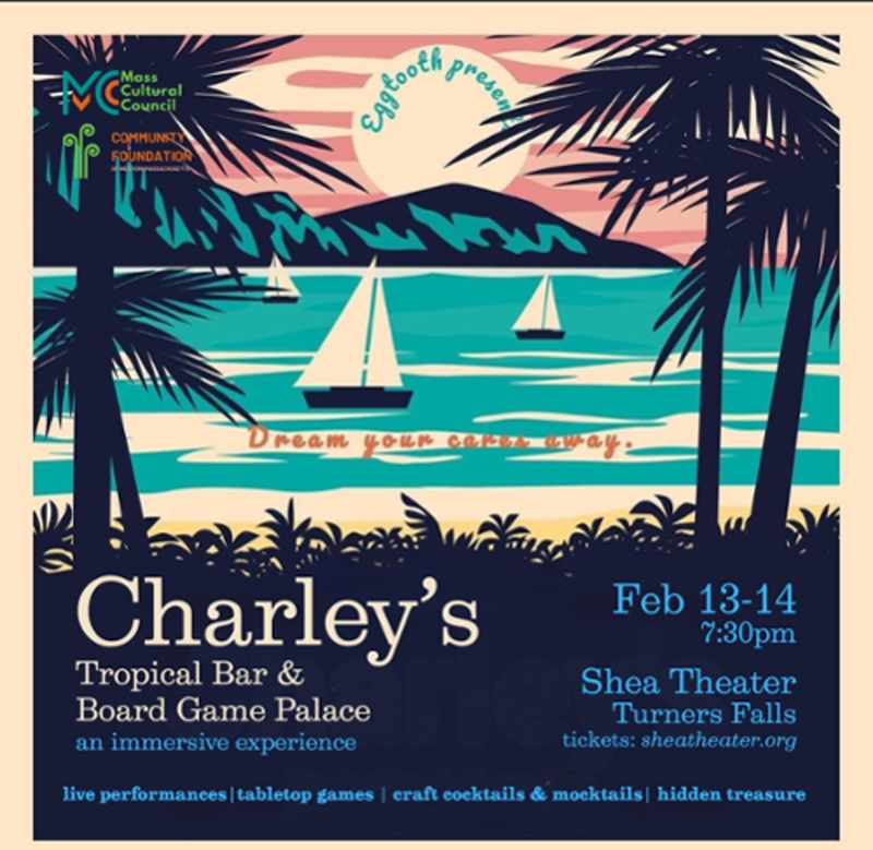 The Shea Theater and Eggtooth Productions present Charley’s Tropical Bar & Board Game Palace: a pop-up bar & immersive experience on Friday, February 13th and Saturday, February 14th. Doors open at 7:30pm. Tickets in advance or at the door are $20 or sliding scale: https://sheatheater.org/