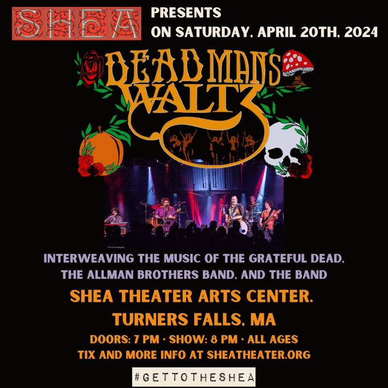 #GETTOTHESHEA on Saturday, April 20th 2024 for a night of Grateful Dead, The Band, and Allman Brothers Band music as performed by Dead Man’s Waltz at the Shea Theater Arts Center in Turners Falls