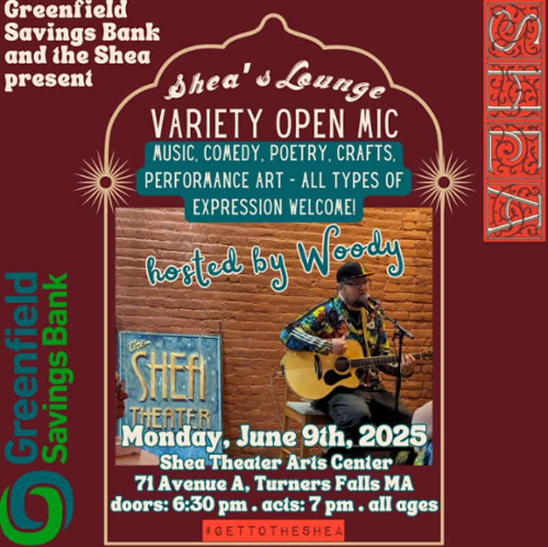 Join us on Monday for the Shea’s Lounge Variety Open Mic! This event is FREE, all ages, and is sponsored by the good people at Greenfield Savings Bank. Come show off your talents. Live paint! Read a poem! Sing a song! Juggle! Anything goes. Signups at 6:30, acts at 7!